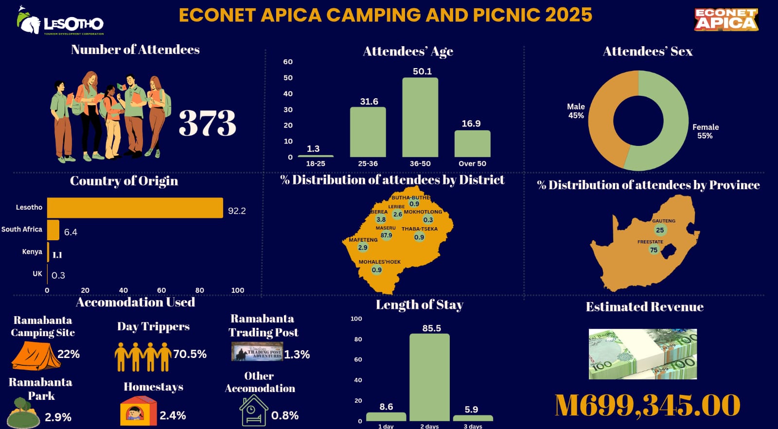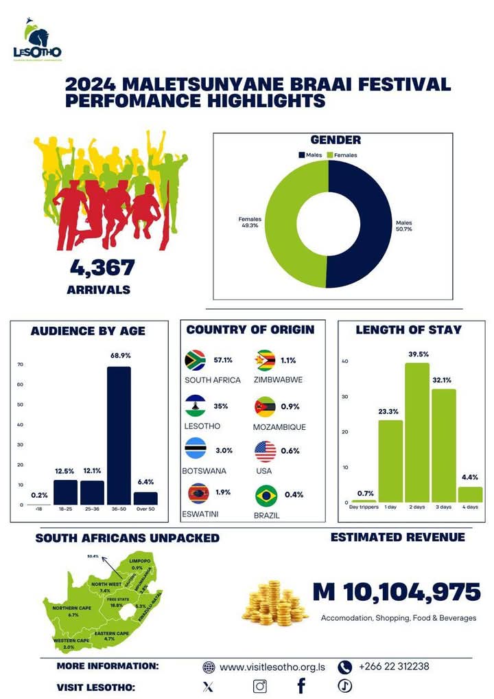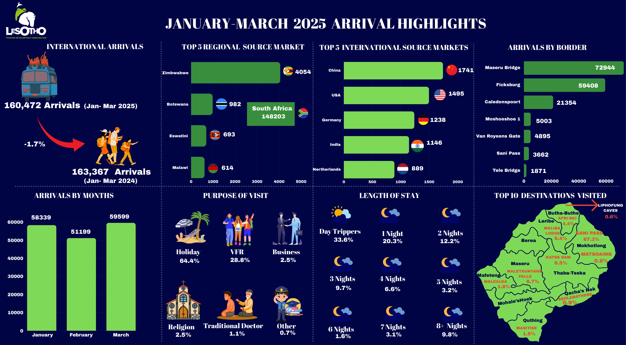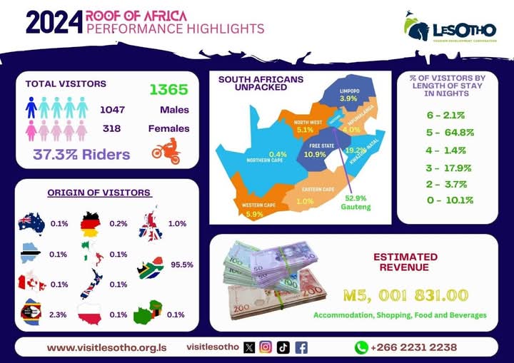 Explore key statistical insights into Lesotho’s tourism landscape through our comprehensive downloadable reports. This section provides data on international arrivals to Lesotho, accommodation capacity and occupancy, visitation numbers to local attractions and other critical tourism data. Data is collected from all ports of entry to Lesotho, licenced accommodation and other tourism related facilities such as: Attractions, Recreational parks, Events, Communities etc. depending on the specific needs within the sector. Accommodation, parks and attraction facilities are to submit the statistics on monthly basis.
